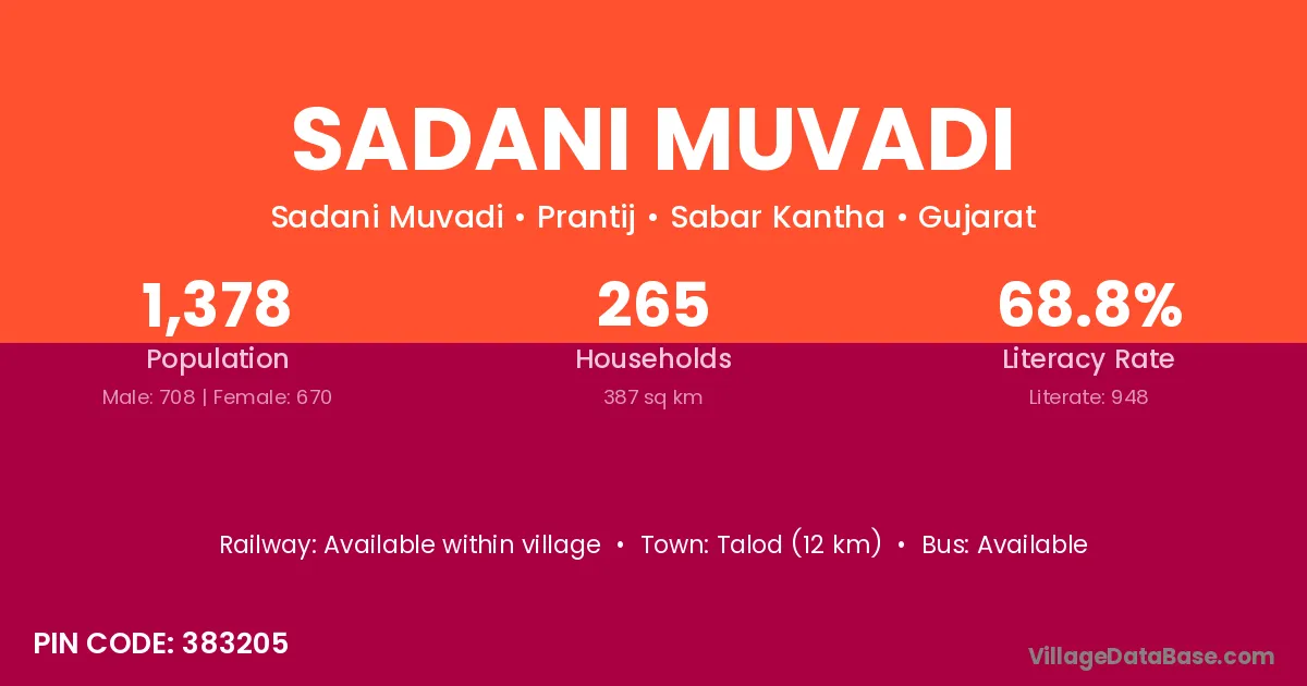 Talod (12 km) is the nearest town to Sadani Muvadi village for major economic activities and is located approximately 12 km away.