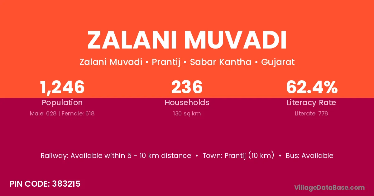 Prantij (10 km) is the nearest town to Zalani Muvadi village for major economic activities and is located approximately 10 km away.