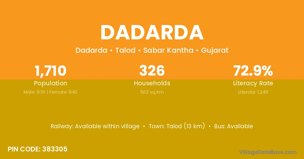 Talod (13 km) is the nearest town to Dadarda village for major economic activities and is located approximately 13 km away.