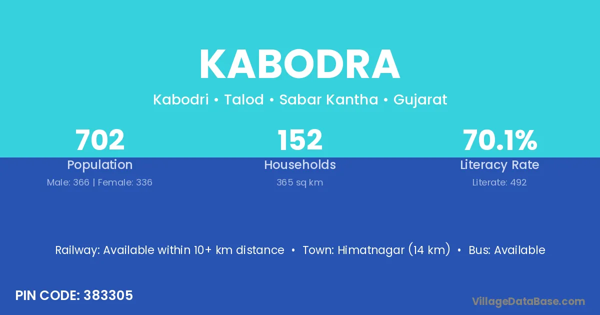 Himatnagar (14 km) is the nearest town to Kabodra village for major economic activities and is located approximately 14 km away.