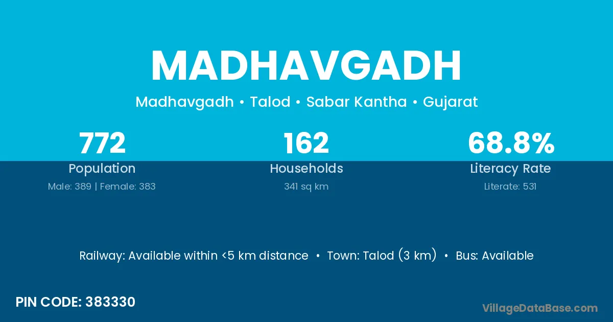 Talod (3 km) is the nearest town to Madhavgadh village for major economic activities and is located approximately 3 km away.