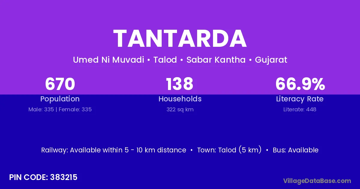 Talod (5 km) is the nearest town to Tantarda village for major economic activities and is located approximately 5 km away.