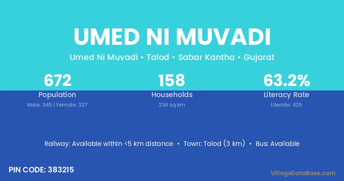 Talod (3 km) is the nearest town to Umed Ni Muvadi village for major economic activities and is located approximately 3 km away.