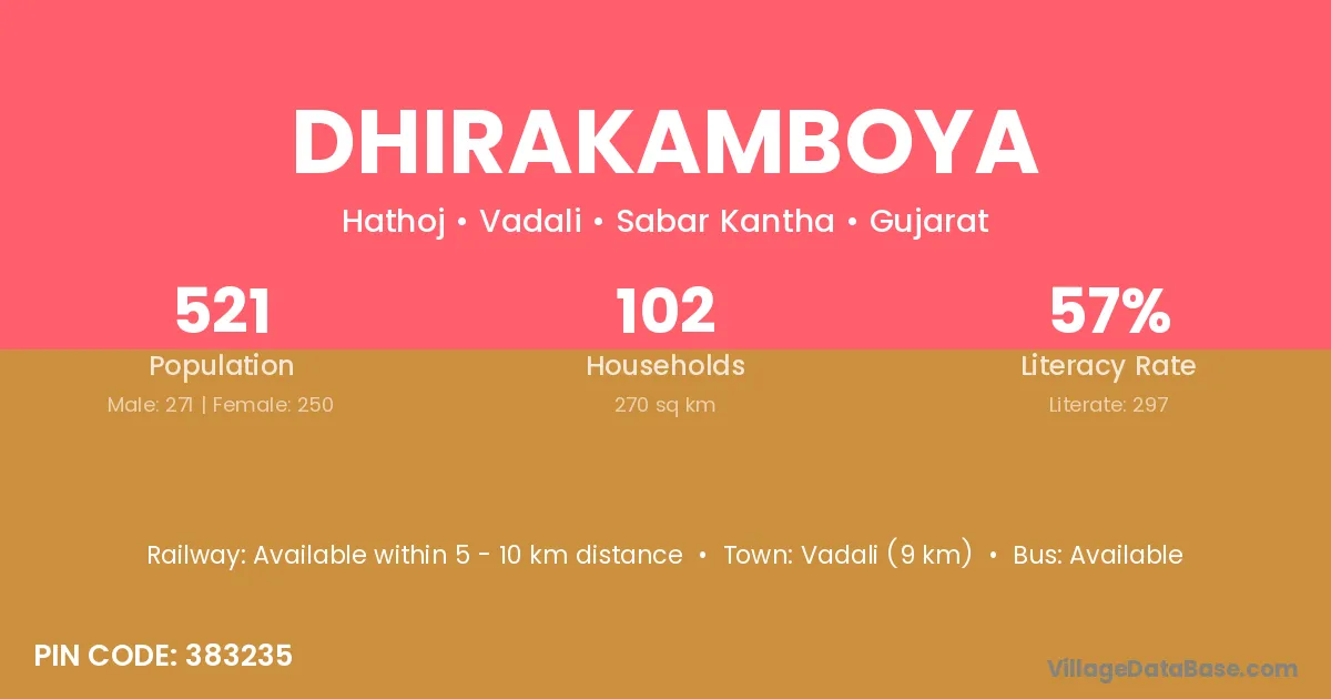 Vadali (9 km) is the nearest town to Dhirakamboya village for major economic activities and is located approximately 9 km away.