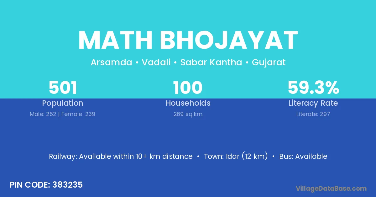 Idar (12 km) is the nearest town to Math Bhojayat village for major economic activities and is located approximately 12 km away.
