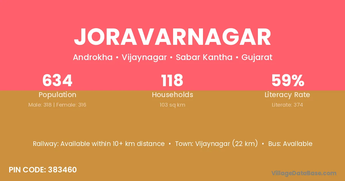Joravarnagar village has a total population of 634 people, of which 318 are males and 316 are females.