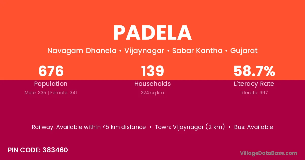 Vijaynagar (2 km) is the nearest town to Padela village for major economic activities and is located approximately 2 km away.