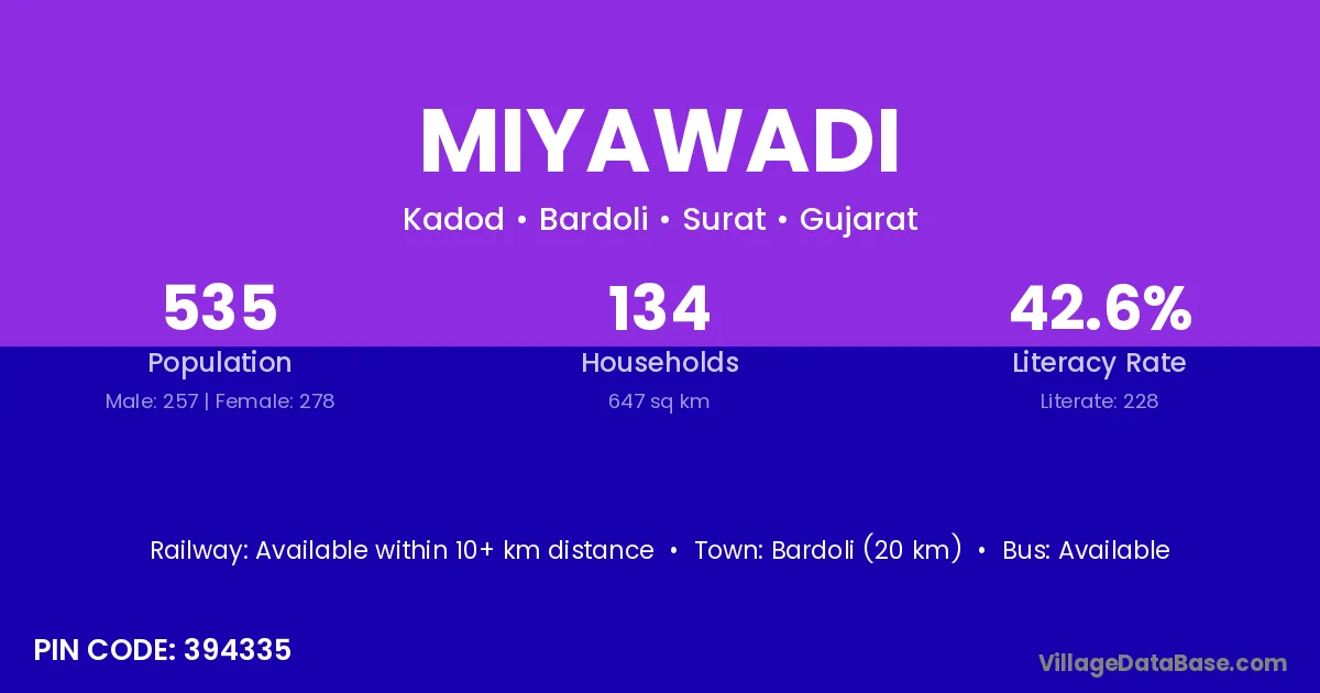 Bardoli (20 km) is the nearest town to Miyawadi village for major economic activities and is located approximately 20 km away.