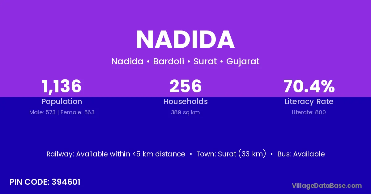 Surat (33 km) is the nearest town to Nadida village for major economic activities and is located approximately 33 km away.