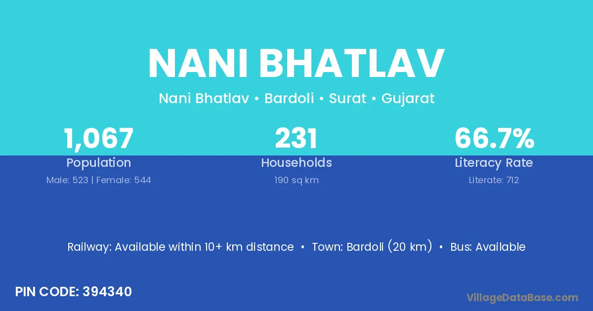 Bardoli (20 km) is the nearest town to Nani Bhatlav village for major economic activities and is located approximately 20 km away.