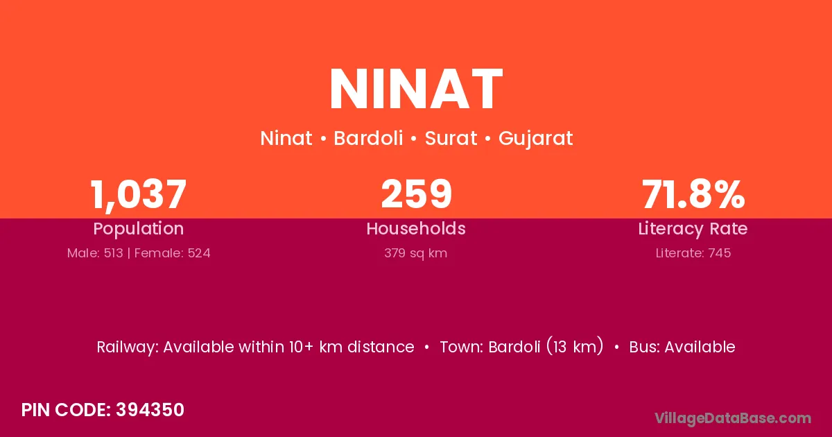 Bardoli (13 km) is the nearest town to Ninat village for major economic activities and is located approximately 13 km away.