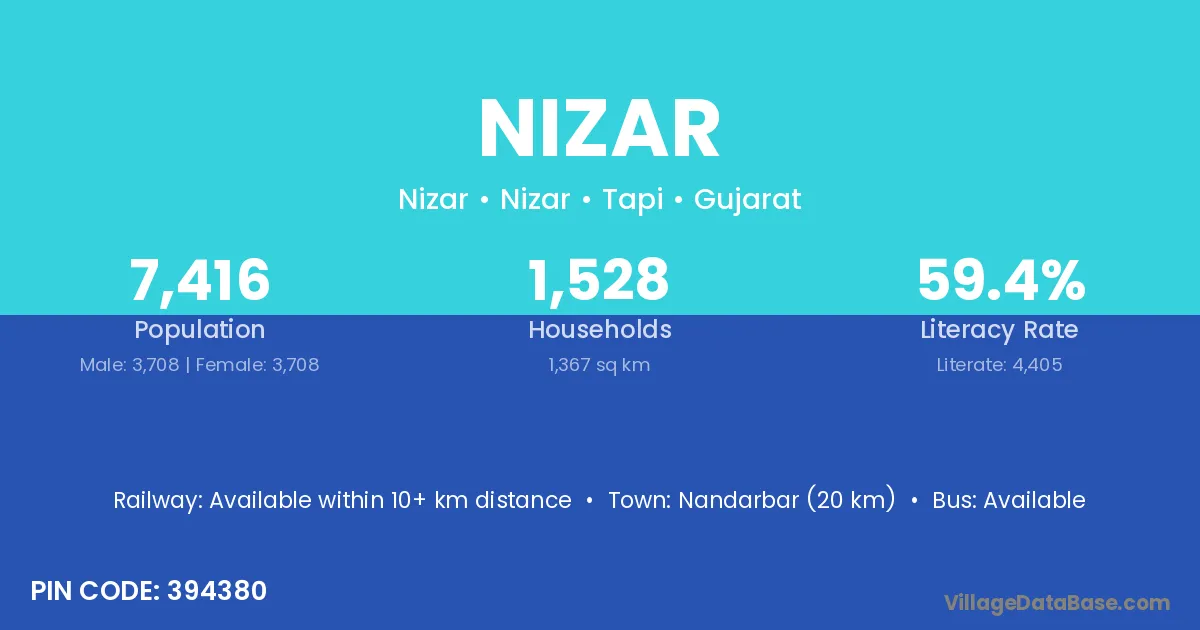 Bardoli (12 km) is the nearest town to Nizar village for major economic activities and is located approximately 12 km away.
