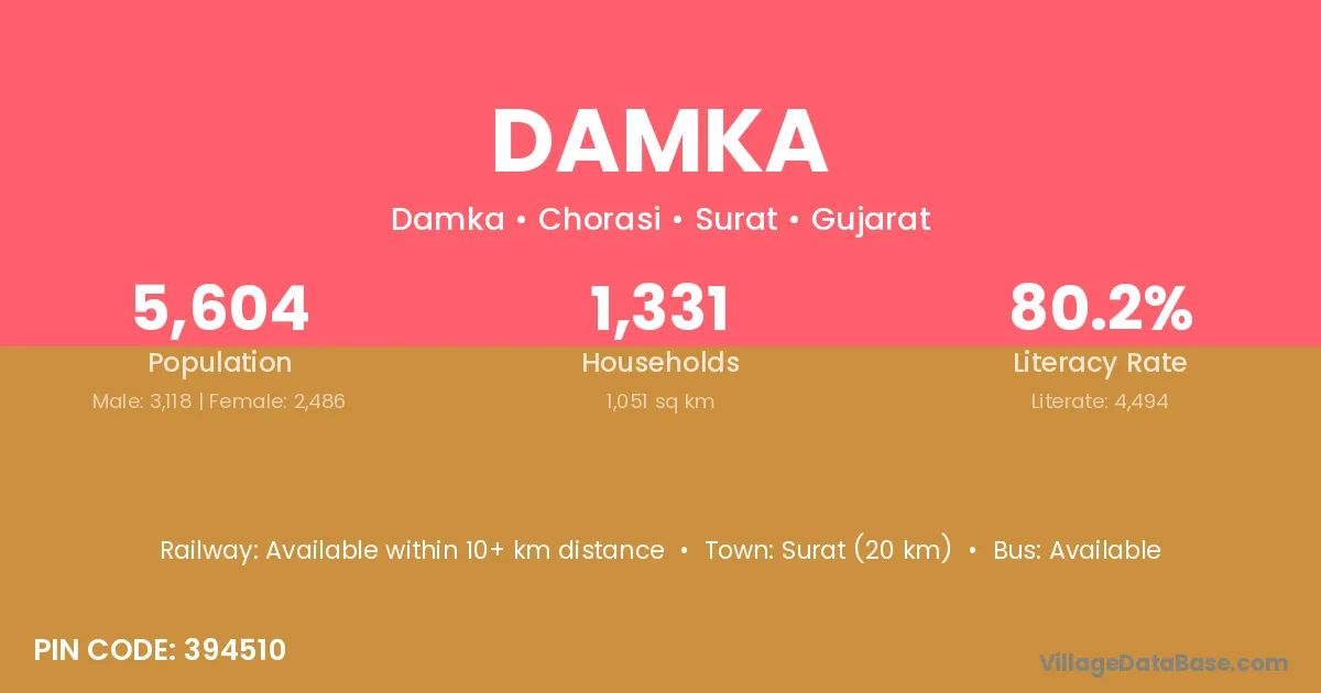Surat (20 km) is the nearest town to Damka village for major economic activities and is located approximately 20 km away.