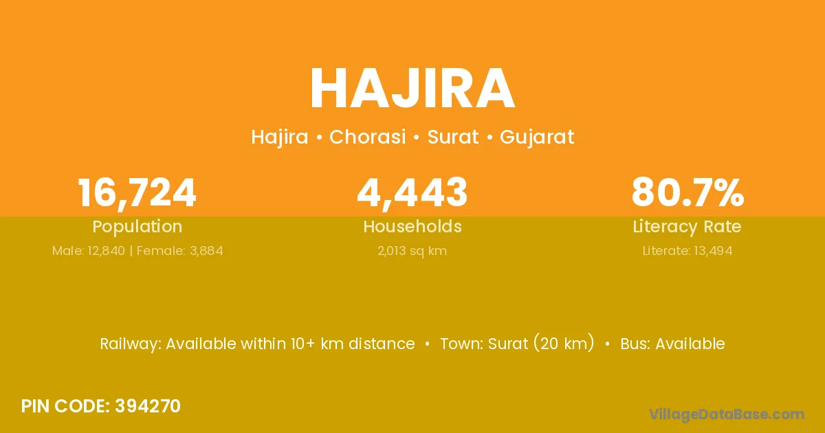 Surat (20 km) is the nearest town to Hajira village for major economic activities and is located approximately 20 km away.