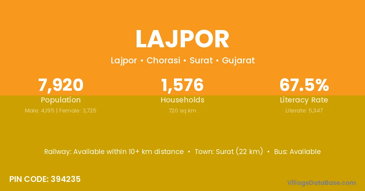 Surat (22 km) is the nearest town to Lajpor village for major economic activities and is located approximately 22 km away.