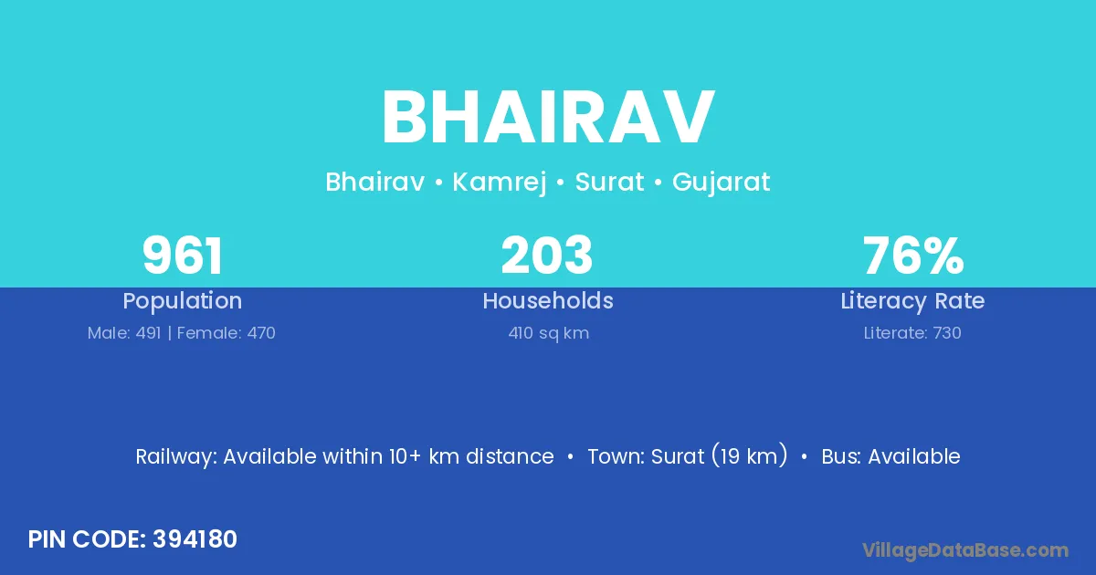 Surat (19 km) is the nearest town to Bhairav village for major economic activities and is located approximately 19 km away.
