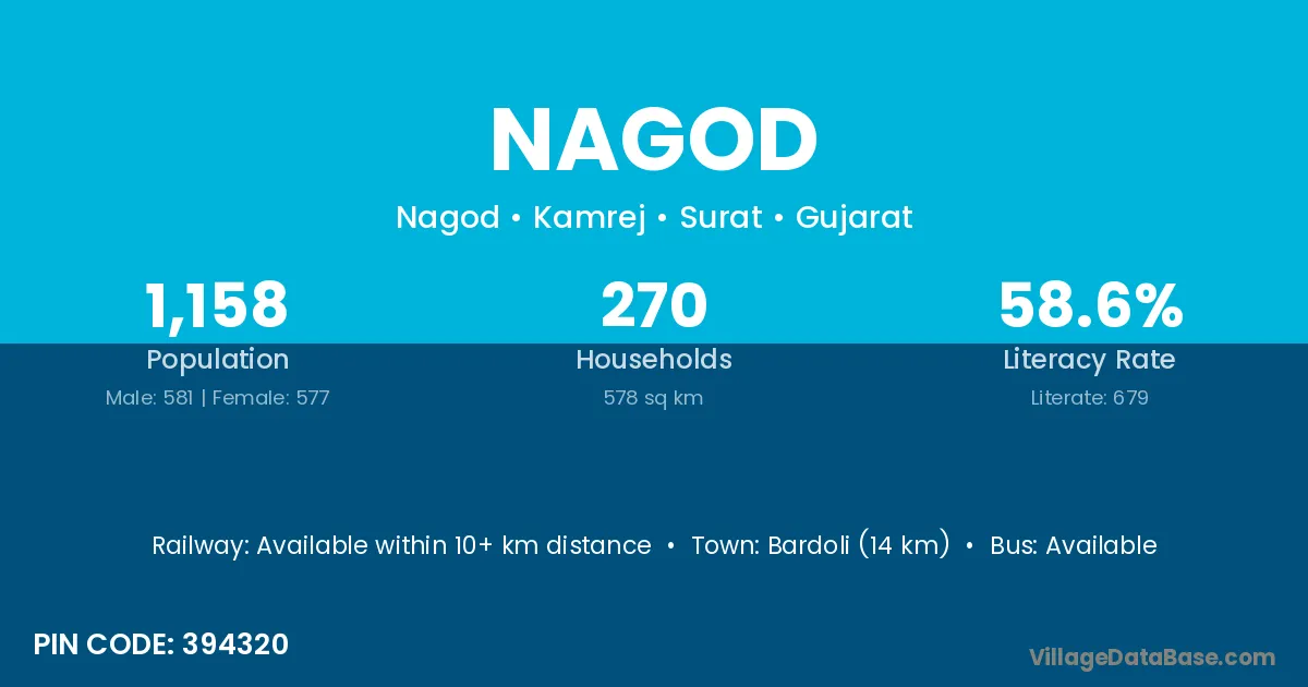 Bardoli (14 km) is the nearest town to Nagod village for major economic activities and is located approximately 14 km away.