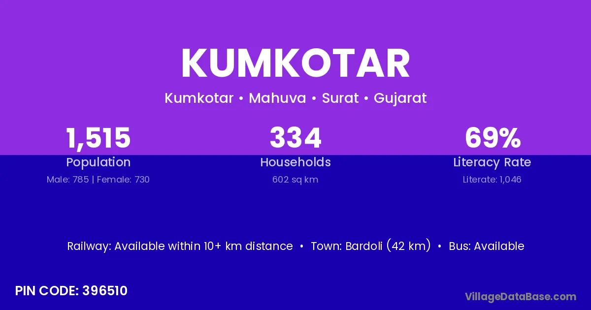 Bardoli (42 km) is the nearest town to Kumkotar village for major economic activities and is located approximately 42 km away.