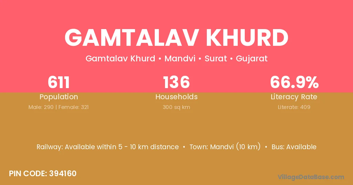 Mandvi (10 km) is the nearest town to Gamtalav Khurd village for major economic activities and is located approximately 10 km away.