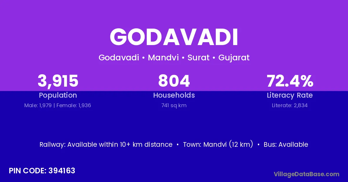 Mandvi (12 km) is the nearest town to Godavadi village for major economic activities and is located approximately 12 km away.