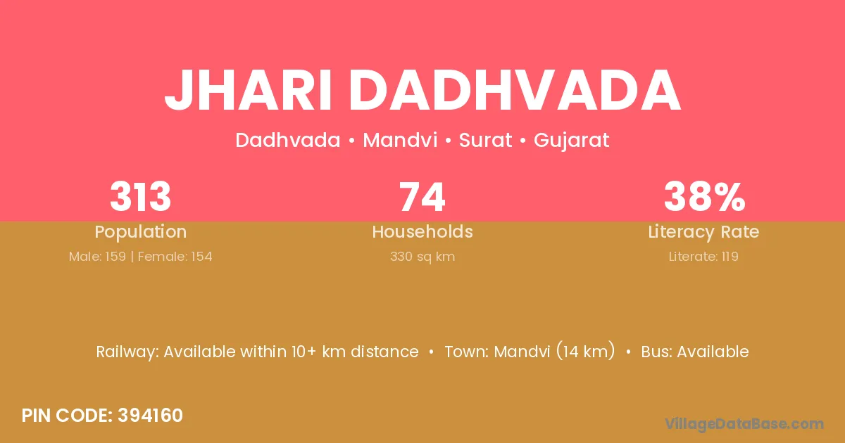 Mandvi (14 km) is the nearest town to Jhari Dadhvada village for major economic activities and is located approximately 14 km away.