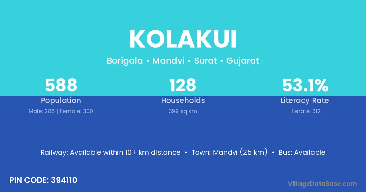 Mandvi (25 km) is the nearest town to Kolakui village for major economic activities and is located approximately 25 km away.
