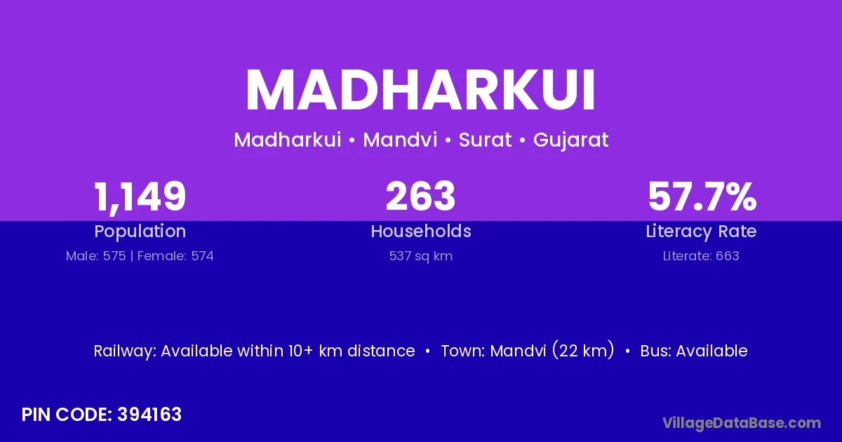 Mandvi (22 km) is the nearest town to Madharkui village for major economic activities and is located approximately 22 km away.