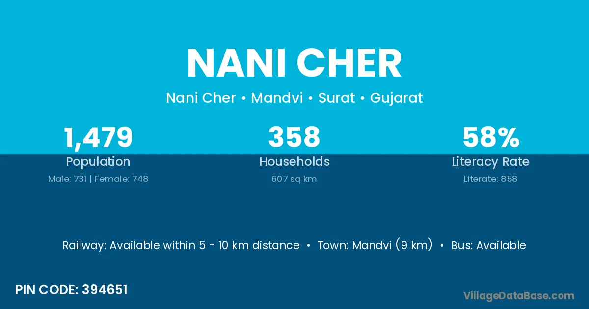 Mandvi (9 km) is the nearest town to Nani Cher village for major economic activities and is located approximately 9 km away.