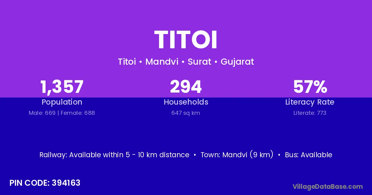 Mandvi (9 km) is the nearest town to Titoi village for major economic activities and is located approximately 9 km away.
