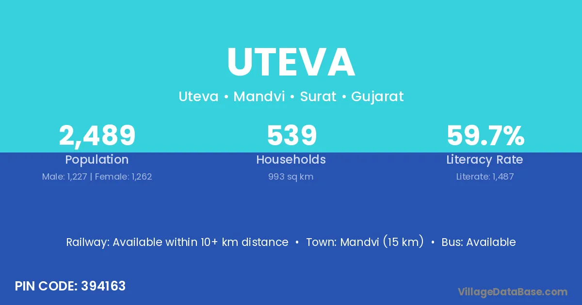 Mandvi (15 km) is the nearest town to Uteva village for major economic activities and is located approximately 15 km away.