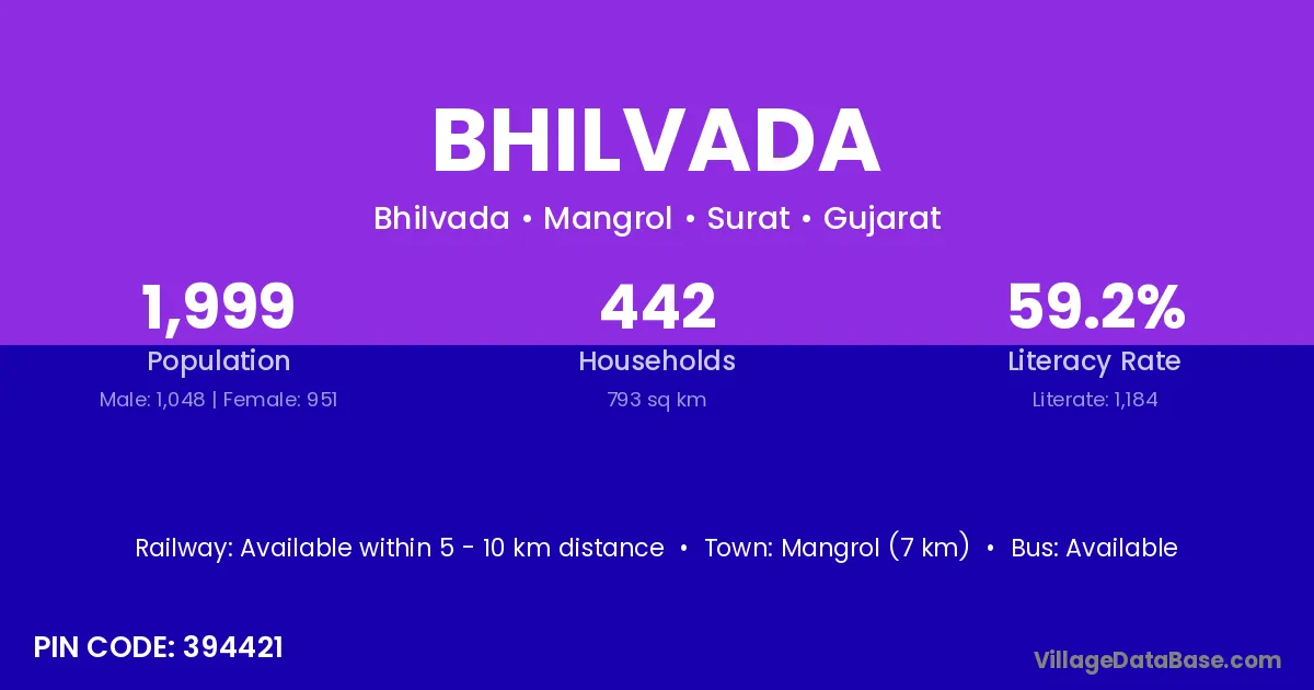 Mangrol (7 km) is the nearest town to Bhilvada village for major economic activities and is located approximately 7 km away.