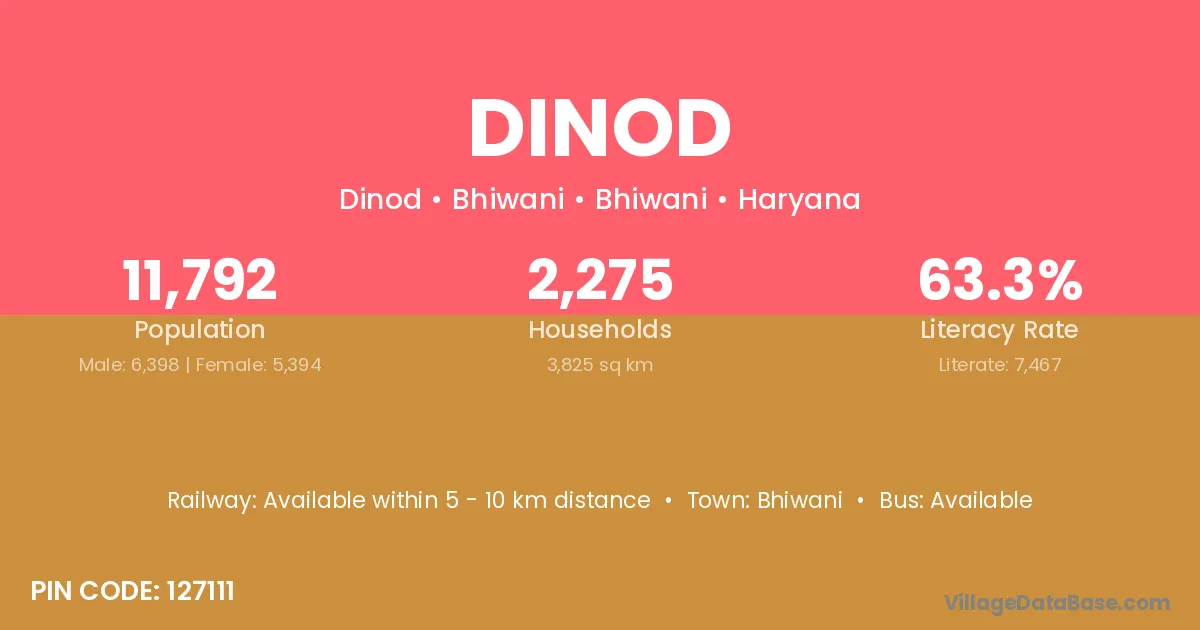 Tarsadi (12 km) is the nearest town to Dinod village for major economic activities and is located approximately 12 km away.
