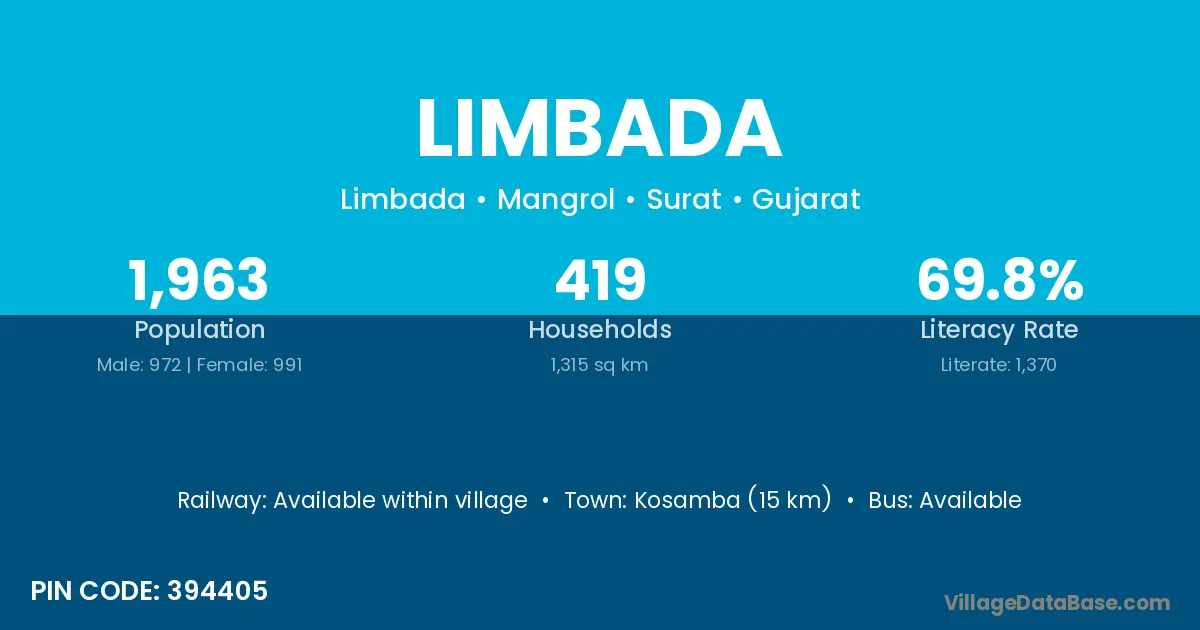 Kosamba (15 km) is the nearest town to Limbada village for major economic activities and is located approximately 15 km away.