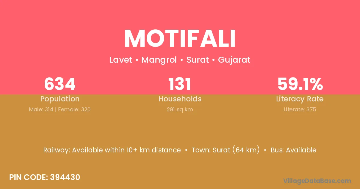 Surat (64 km) is the nearest town to Motifali village for major economic activities and is located approximately 64 km away.