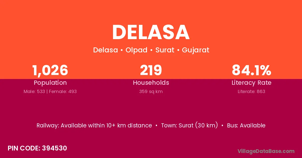 Surat (30 km) is the nearest town to Delasa village for major economic activities and is located approximately 30 km away.
