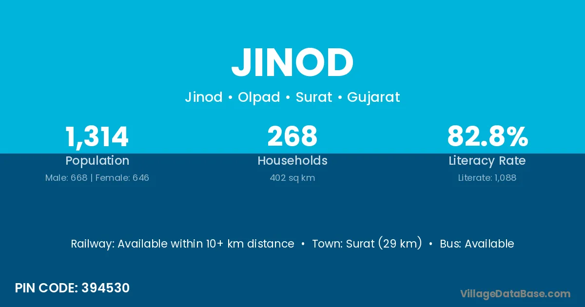 Surat (29 km) is the nearest town to Jinod village for major economic activities and is located approximately 29 km away.