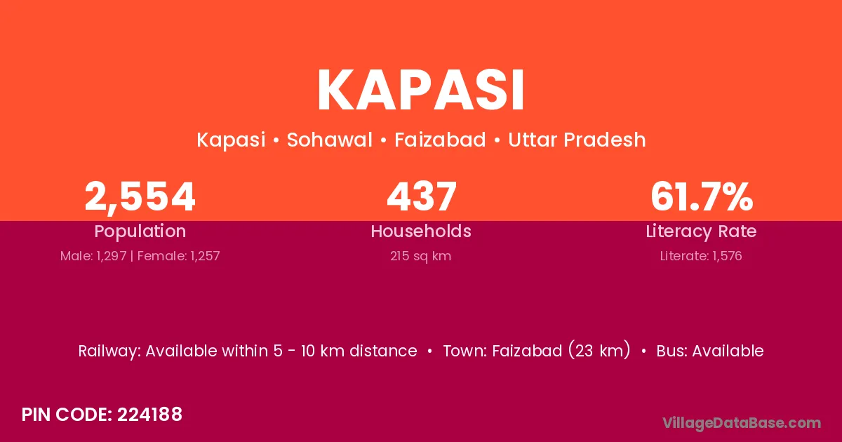 The literacy rate of Kapasi village is 83.69%. Male literacy stands at 84.95% and female literacy at 81.90%.