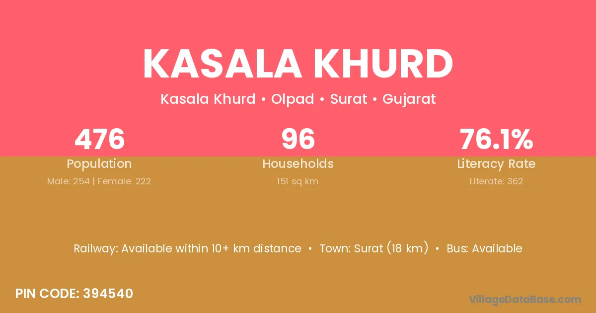 Surat (18 km) is the nearest town to Kasala Khurd village for major economic activities and is located approximately 18 km away.