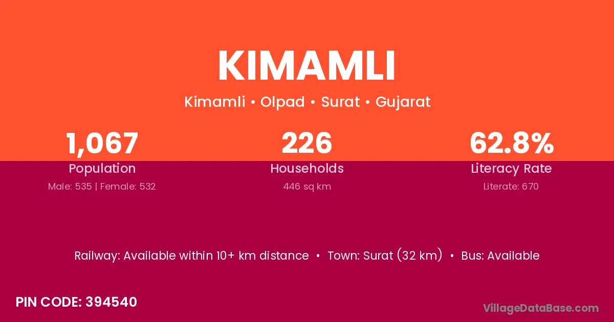 Surat (32 km) is the nearest town to Kimamli village for major economic activities and is located approximately 32 km away.