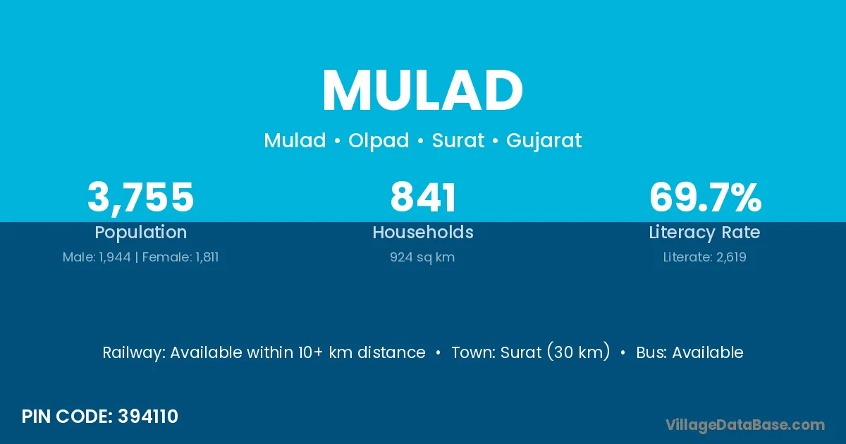 Surat (30 km) is the nearest town to Mulad village for major economic activities and is located approximately 30 km away.