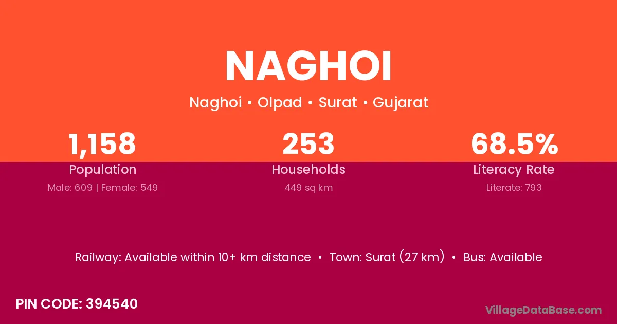 Surat (27 km) is the nearest town to Naghoi village for major economic activities and is located approximately 27 km away.