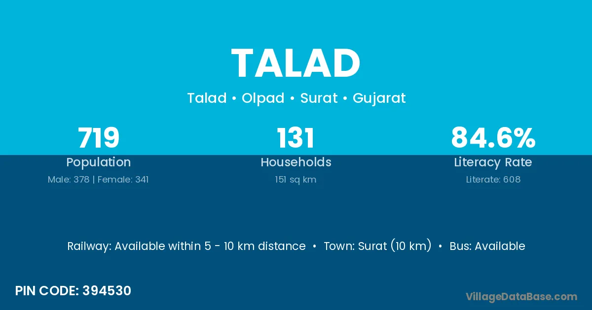 Surat (10 km) is the nearest town to Talad village for major economic activities and is located approximately 10 km away.