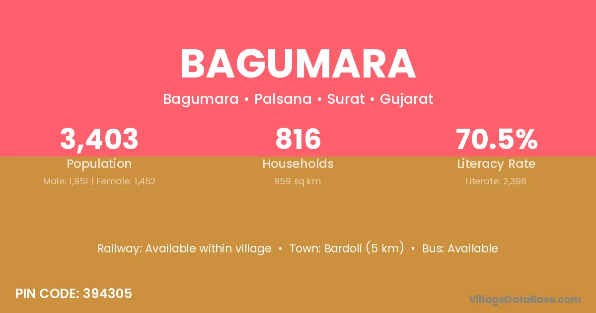 Bardoli (5 km) is the nearest town to Bagumara village for major economic activities and is located approximately 5 km away.