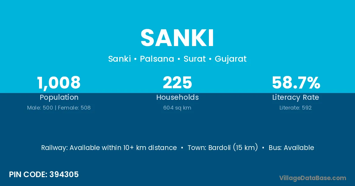 Bardoli (15 km) is the nearest town to Sanki village for major economic activities and is located approximately 15 km away.