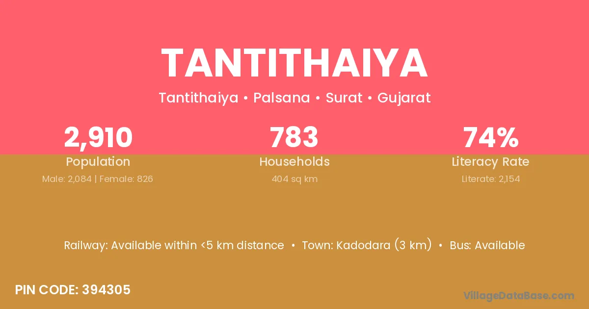 Kadodara (3 km) is the nearest town to Tantithaiya village for major economic activities and is located approximately 3 km away.