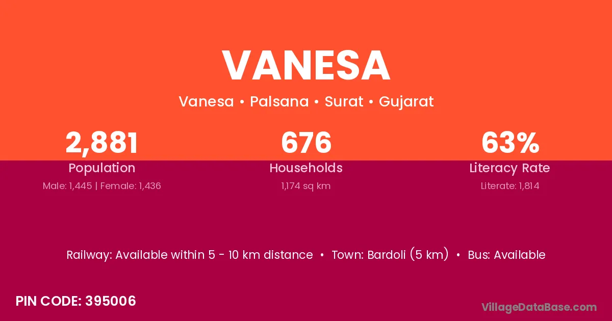 Bardoli (5 km) is the nearest town to Vanesa village for major economic activities and is located approximately 5 km away.