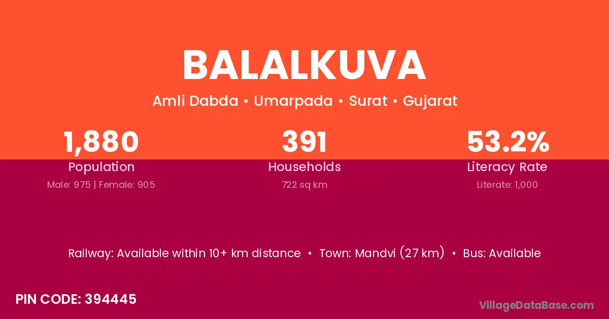 Mandvi (27 km) is the nearest town to Balalkuva village for major economic activities and is located approximately 27 km away.
