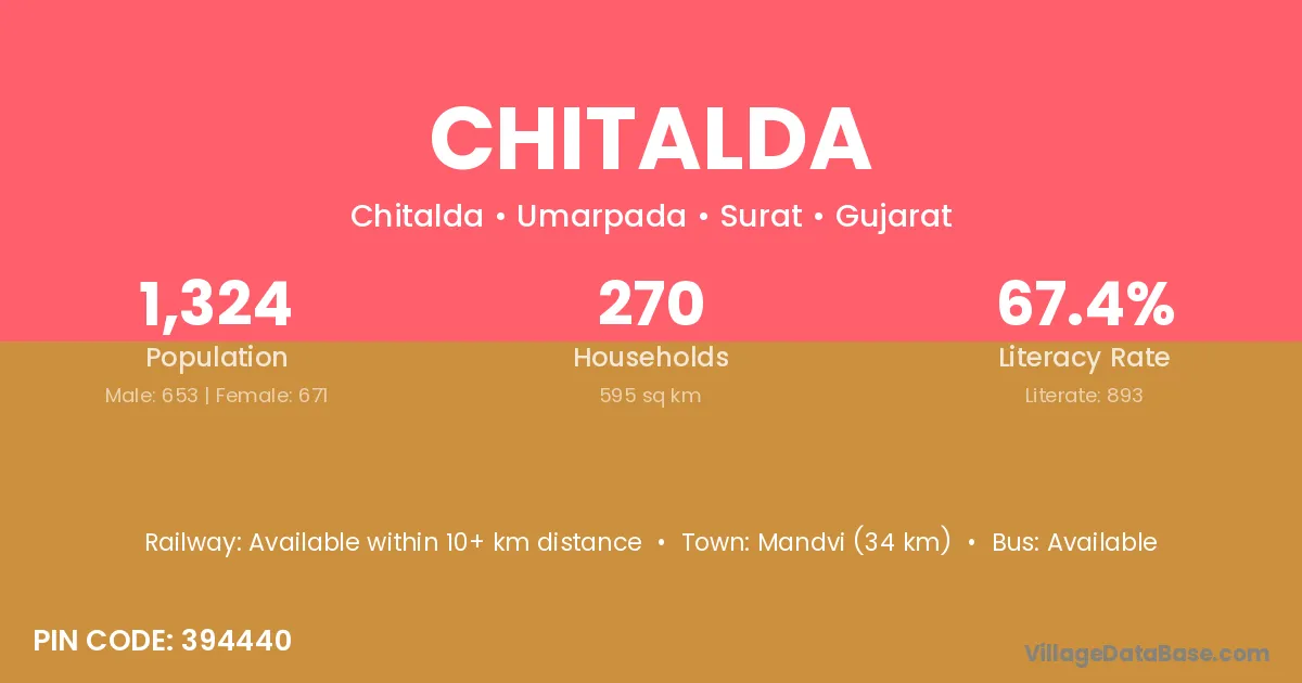Chitalda village has a total population of 1,324 people, of which 653 are males and 671 are females.