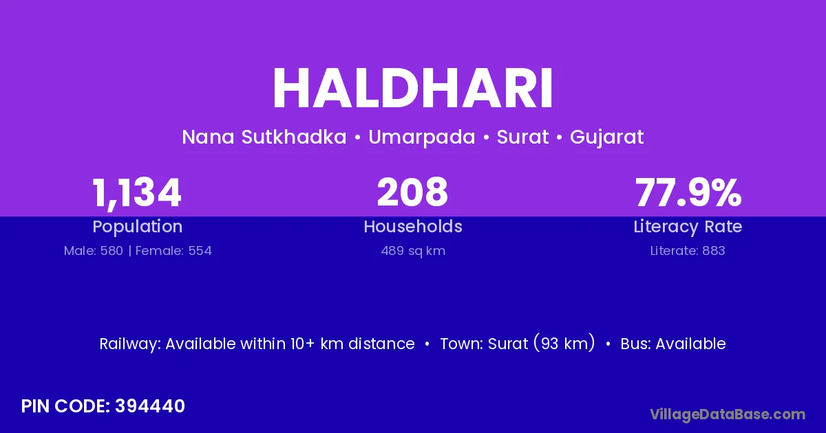 Surat (93 km) is the nearest town to Haldhari village for major economic activities and is located approximately 93 km away.