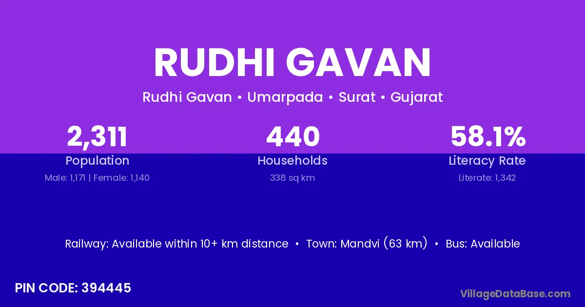 Mandvi (63 km) is the nearest town to Rudhi Gavan village for major economic activities and is located approximately 63 km away.